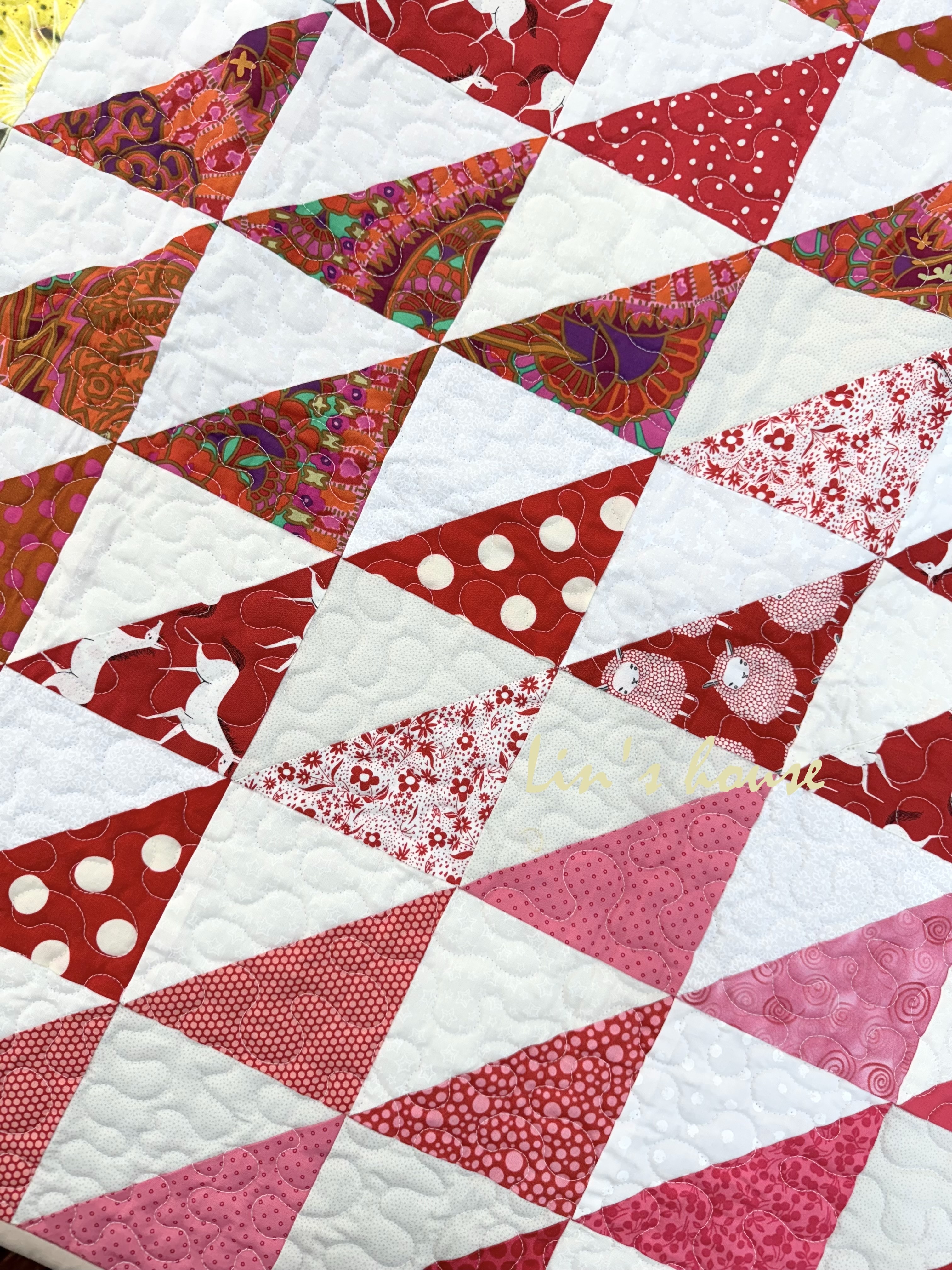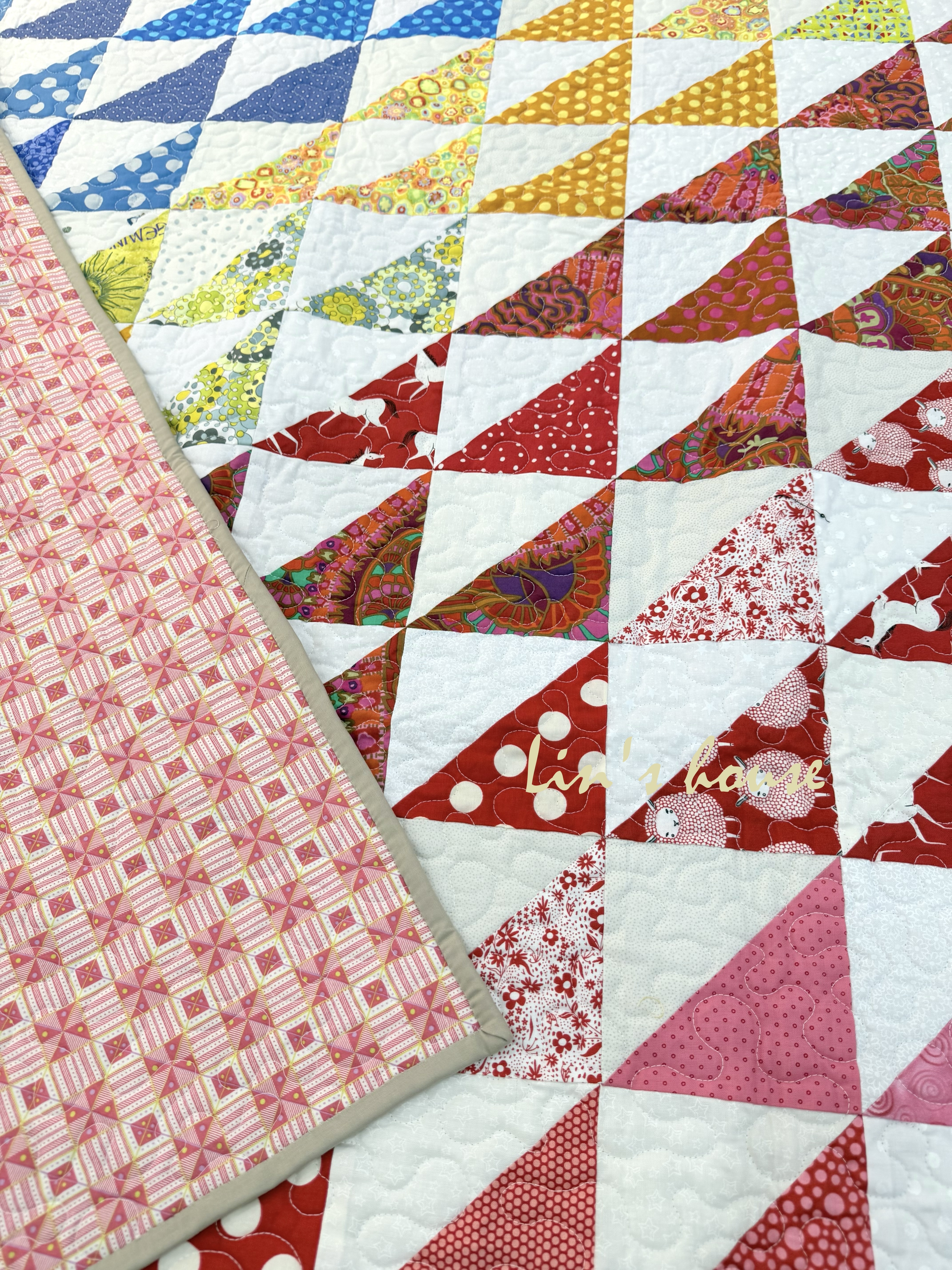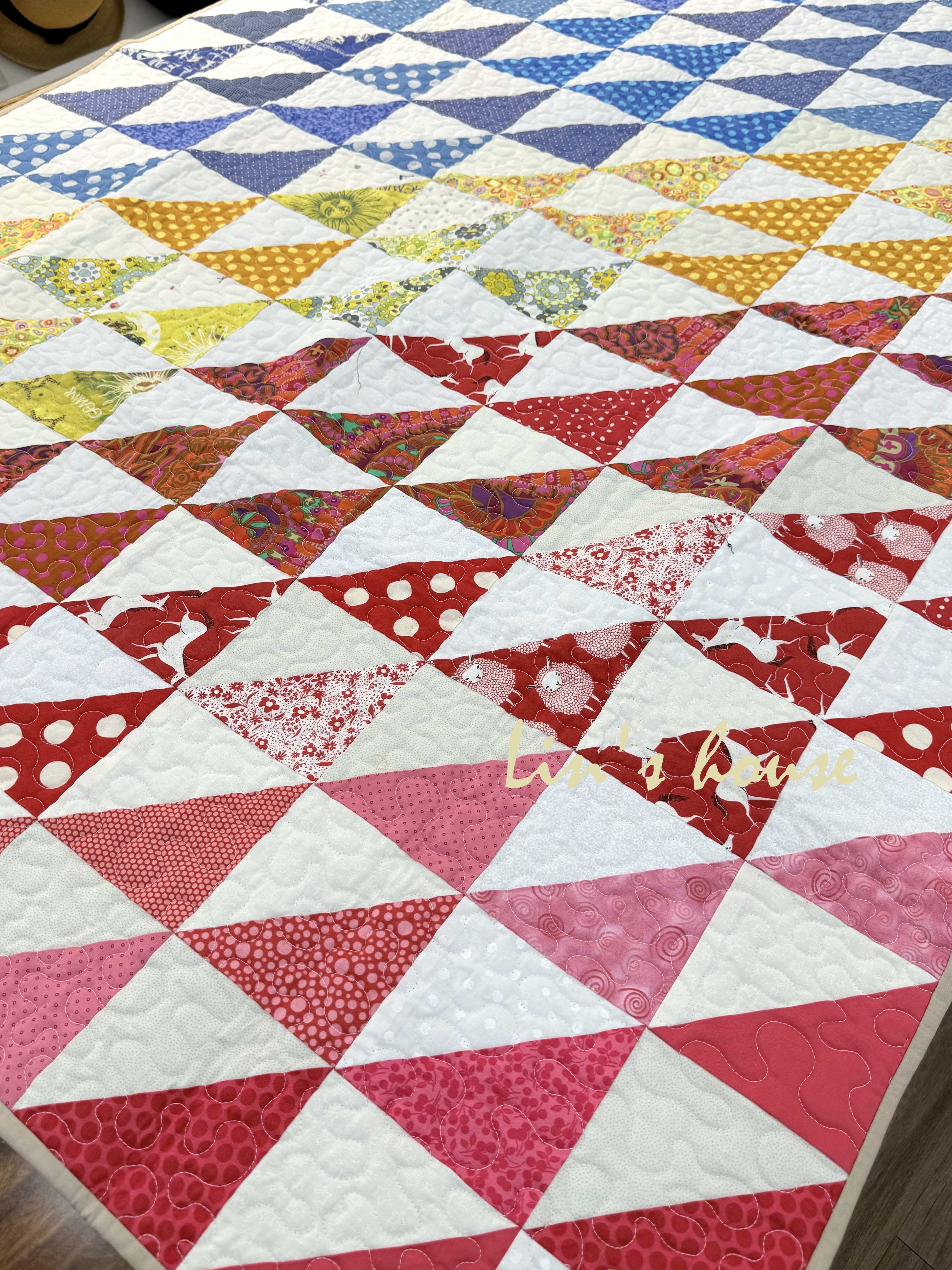 這件作品以經典的「Half Square Triangle(半三角形)」單元為基礎,透過精準的拼接展現色彩的漸層與流動感。從深藍、淺藍逐步過渡至明亮的黃、橙,最後延伸至熱情的紅與粉嫩的粉色,彷彿一場從清晨到黃昏的彩虹之舞。