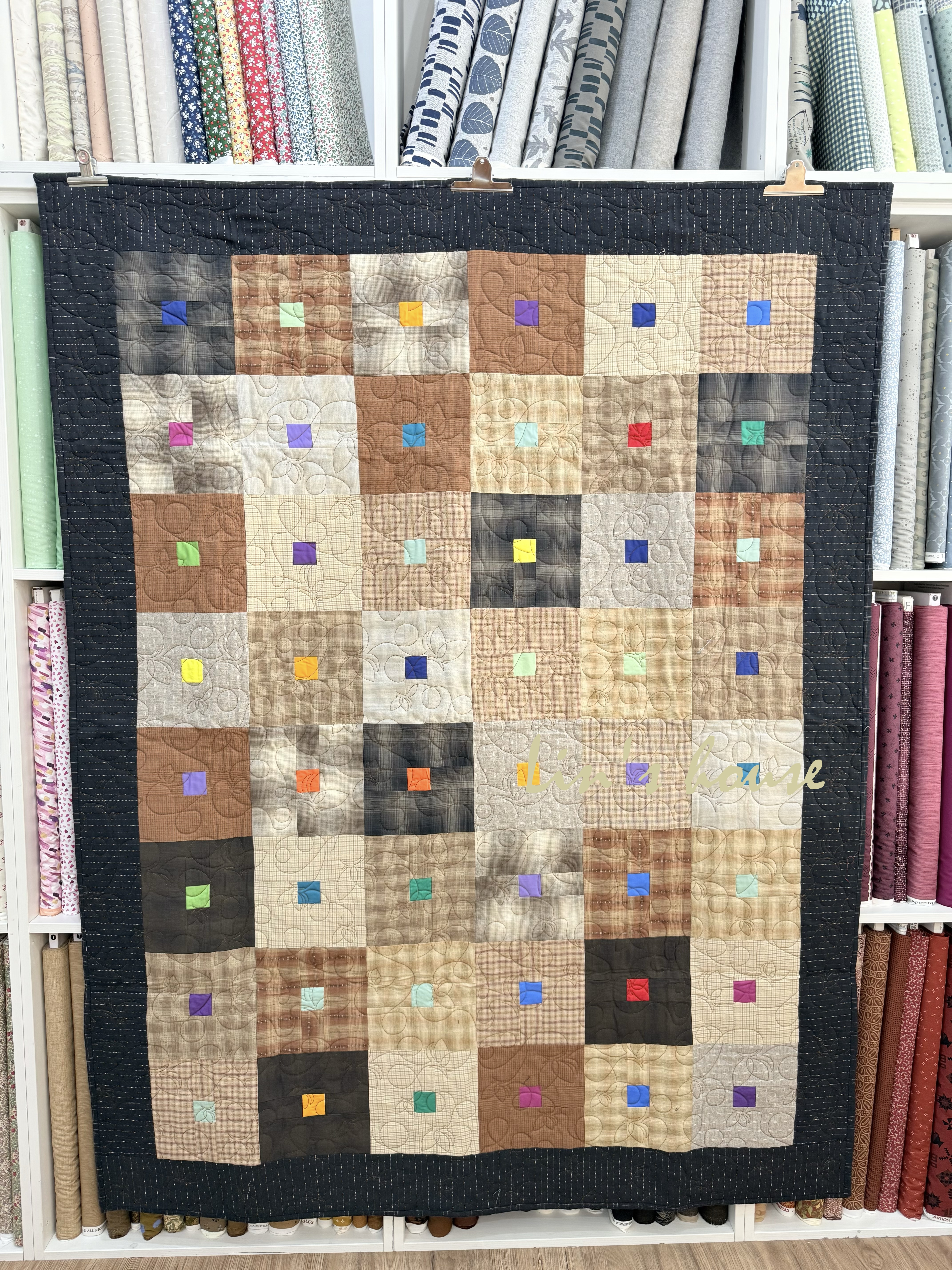 這件拼布作品以經典的 九宮格延伸設計 為基礎,每一個大方塊中央嵌入一枚小小的彩色方形,形成「方中有方」的趣味視覺效果。底色以溫潤的米色、駝色、棕色及灰黑色為主調,帶出低調質樸的氛圍;中央的小方塊則採用鮮豔的紫、藍、橘、紅、綠、黃等色點綴,如同夜空中的星光,在沉穩背景中閃爍出生命的亮彩。