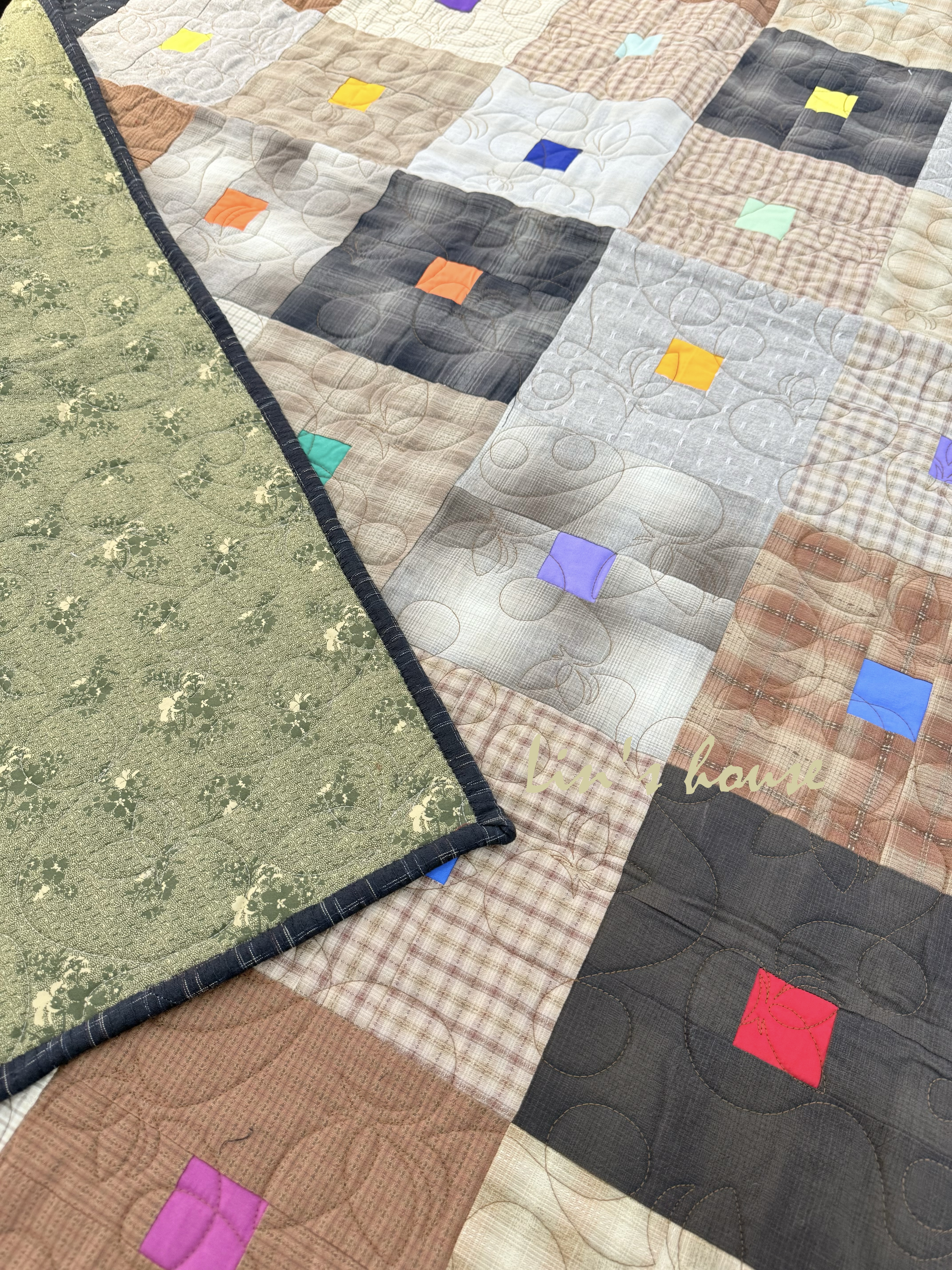 這是一件 融合克制與奔放 的拼布,被褥間保留了寧靜與詩意,而每一抹小方塊的亮色,則象徵著生活中那些不容忽視的溫暖與希望。