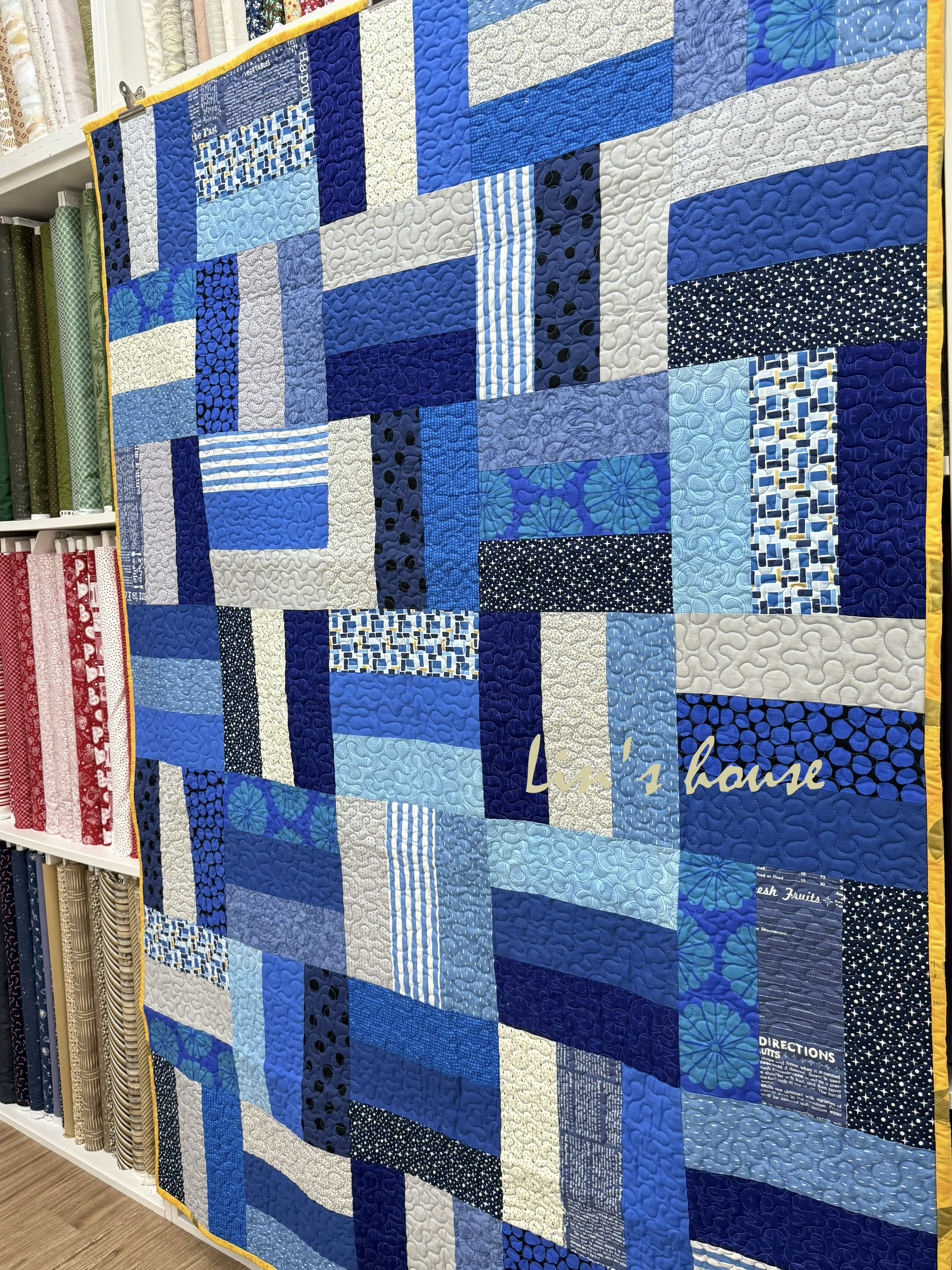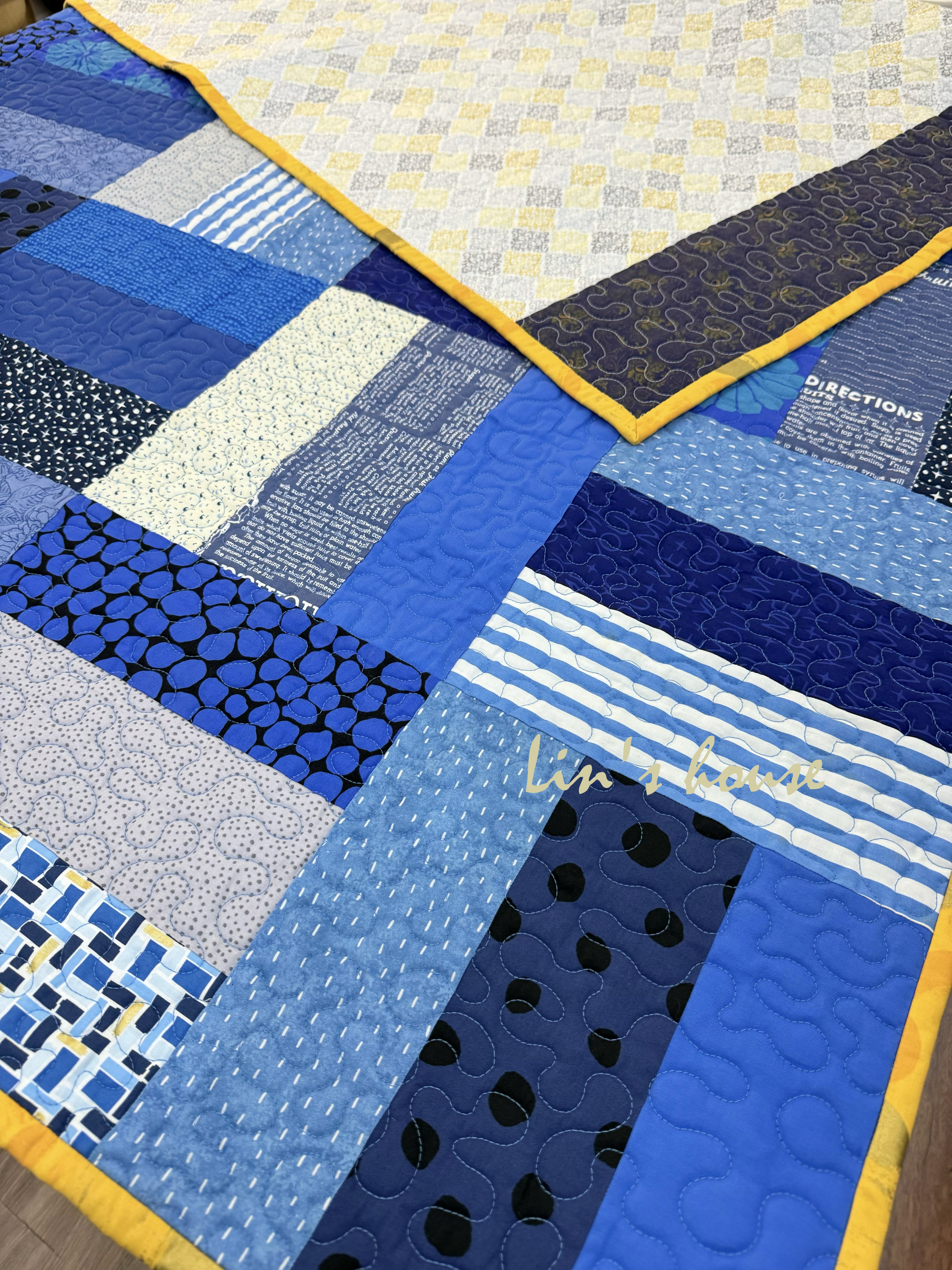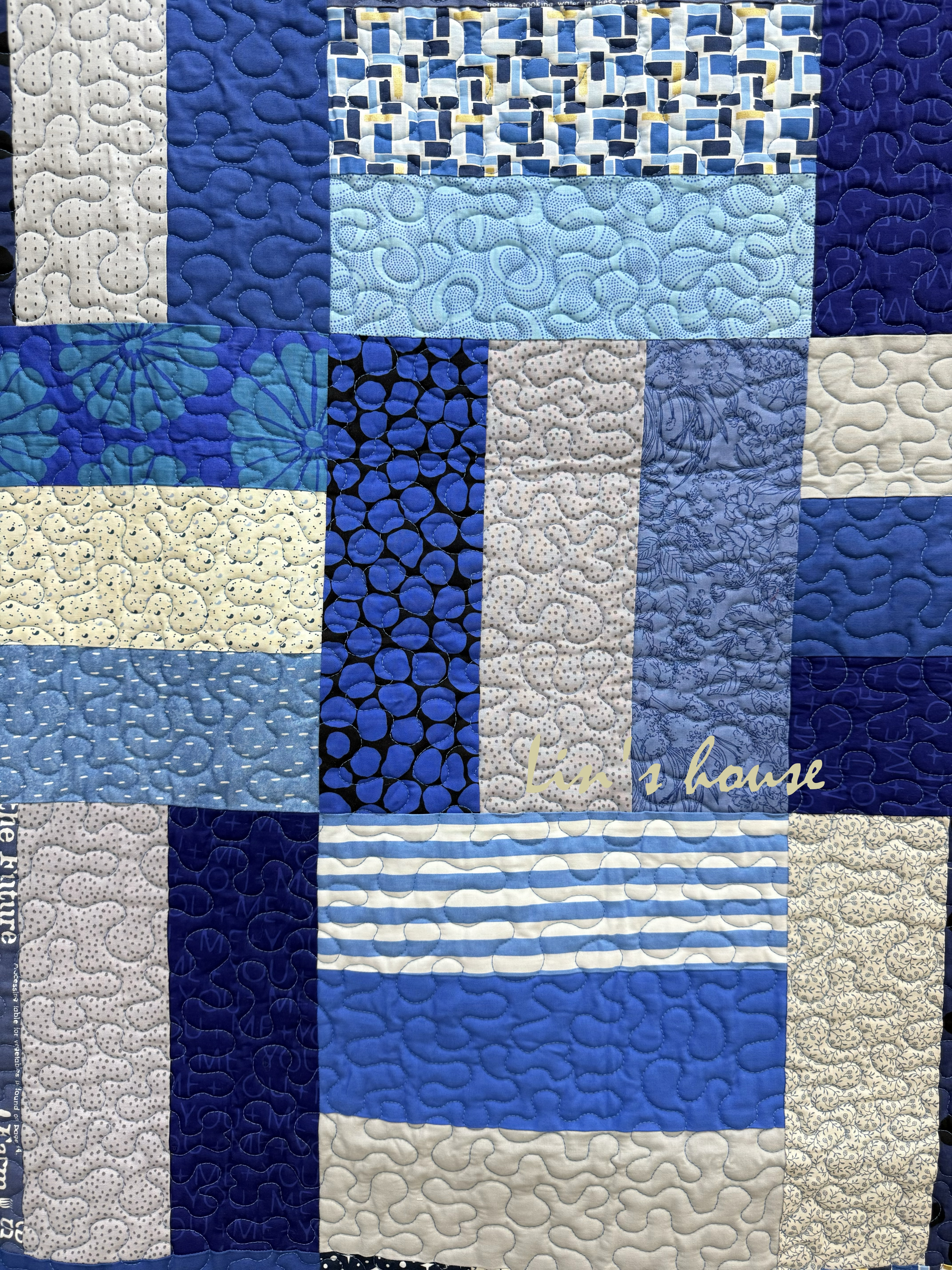 不同紋理的藍布——條紋、圓點、文字與抽象印花——