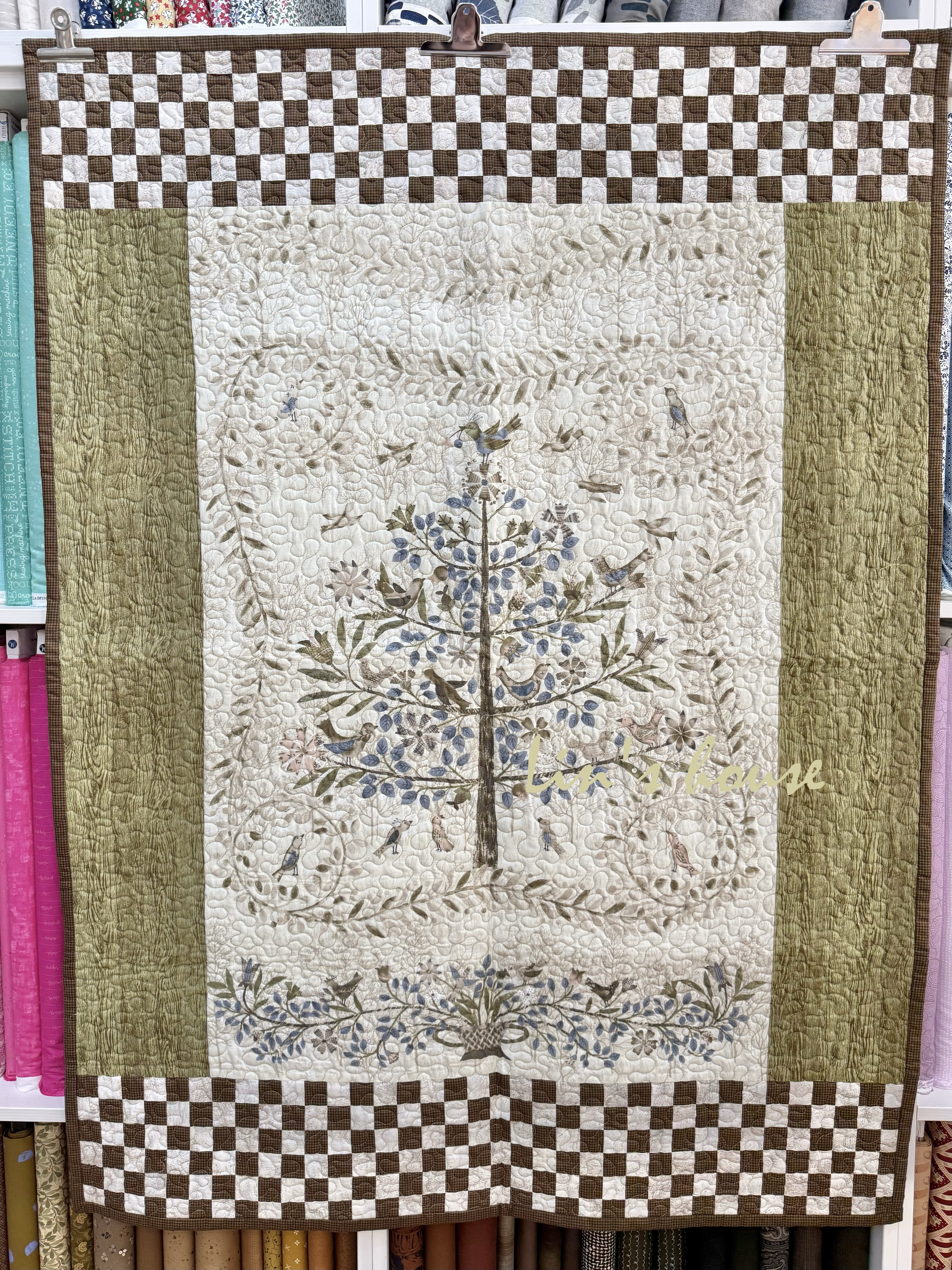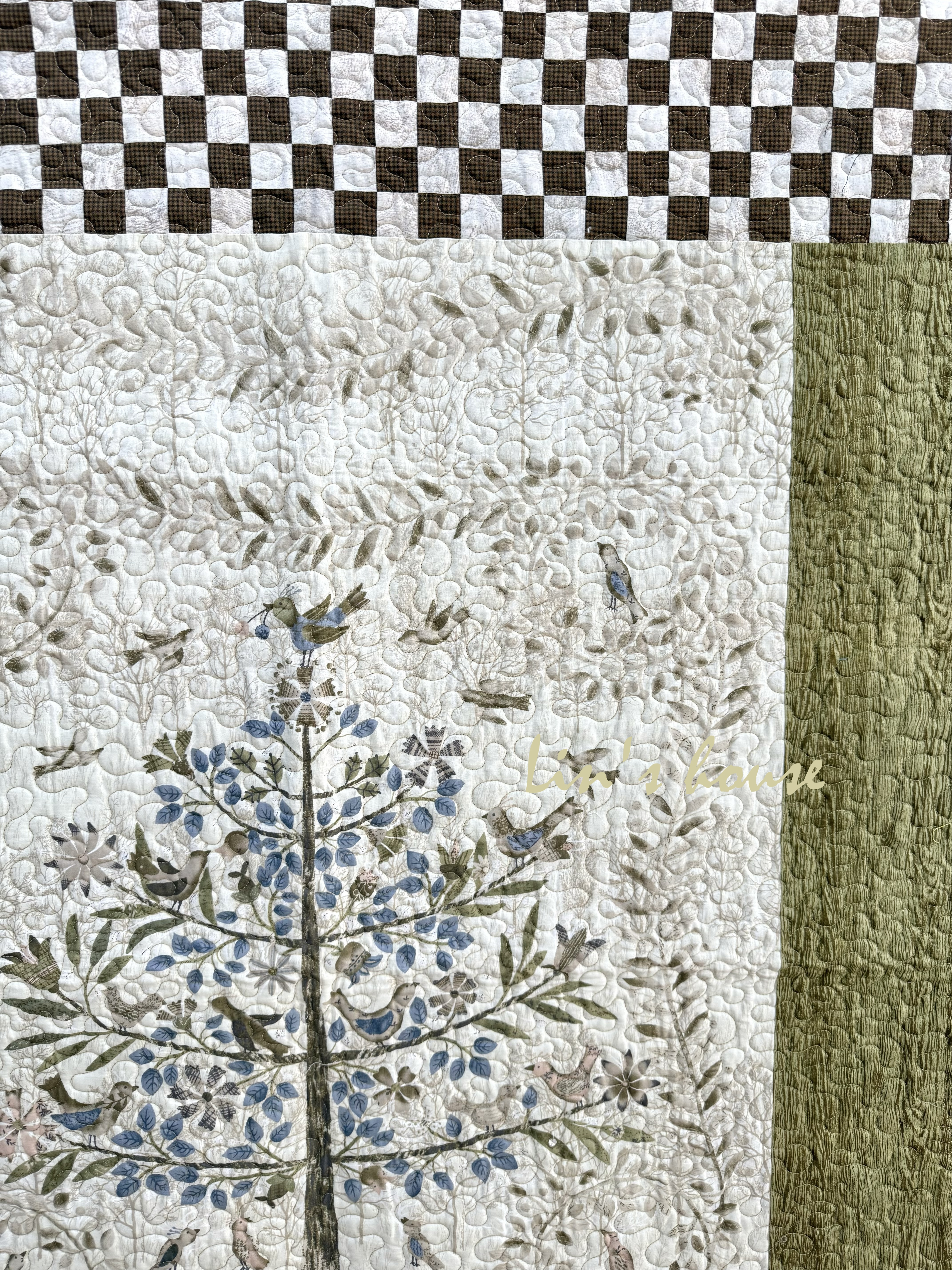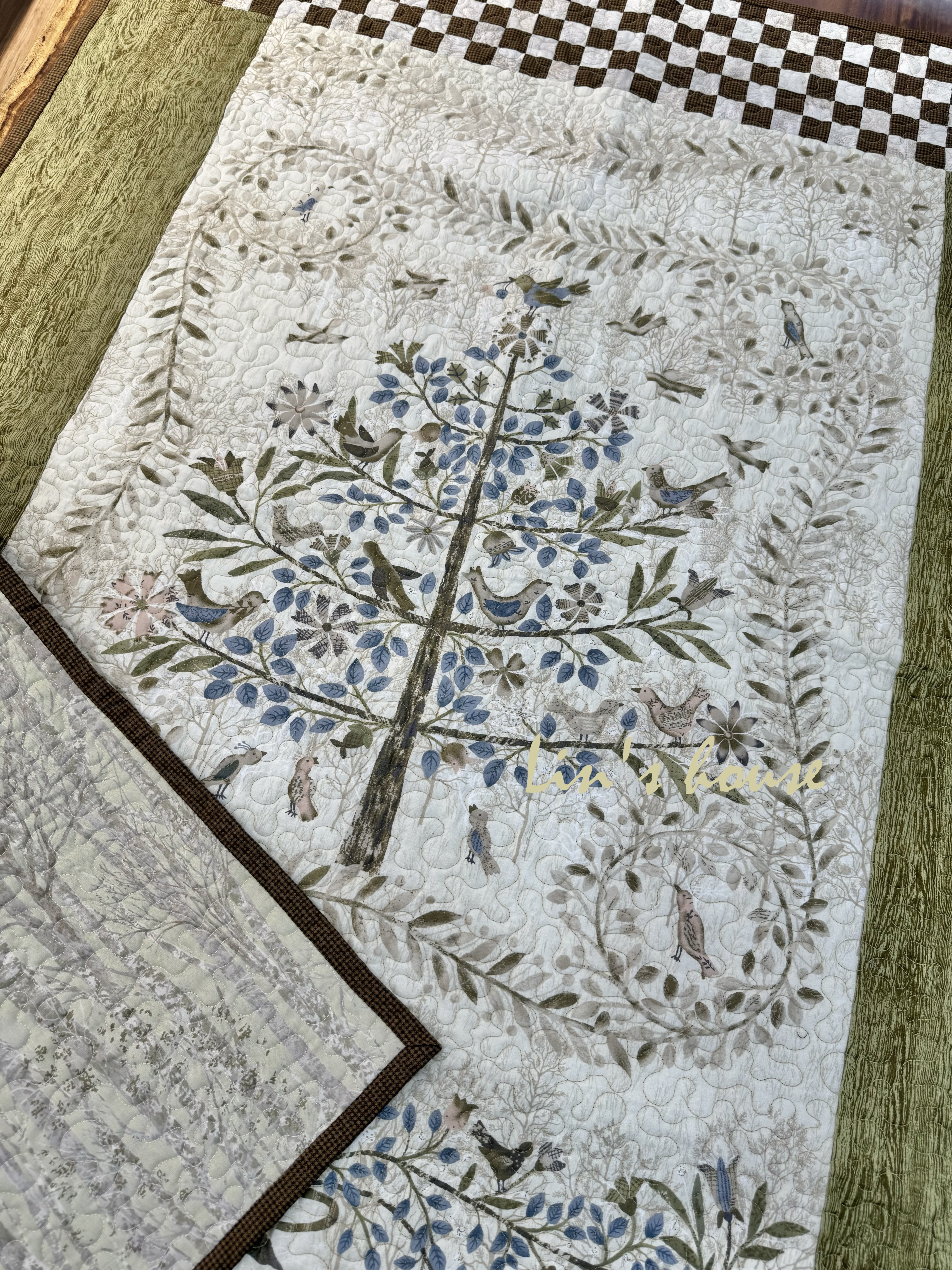 主體布料以細緻印花堆疊出如森林般的深遠層次,兩側草綠色布面象徵大地的溫潤與再生;上下邊框以咖啡與米白的棋盤格構築,穩定整體結構,也為作品添上古典手作的韻味。