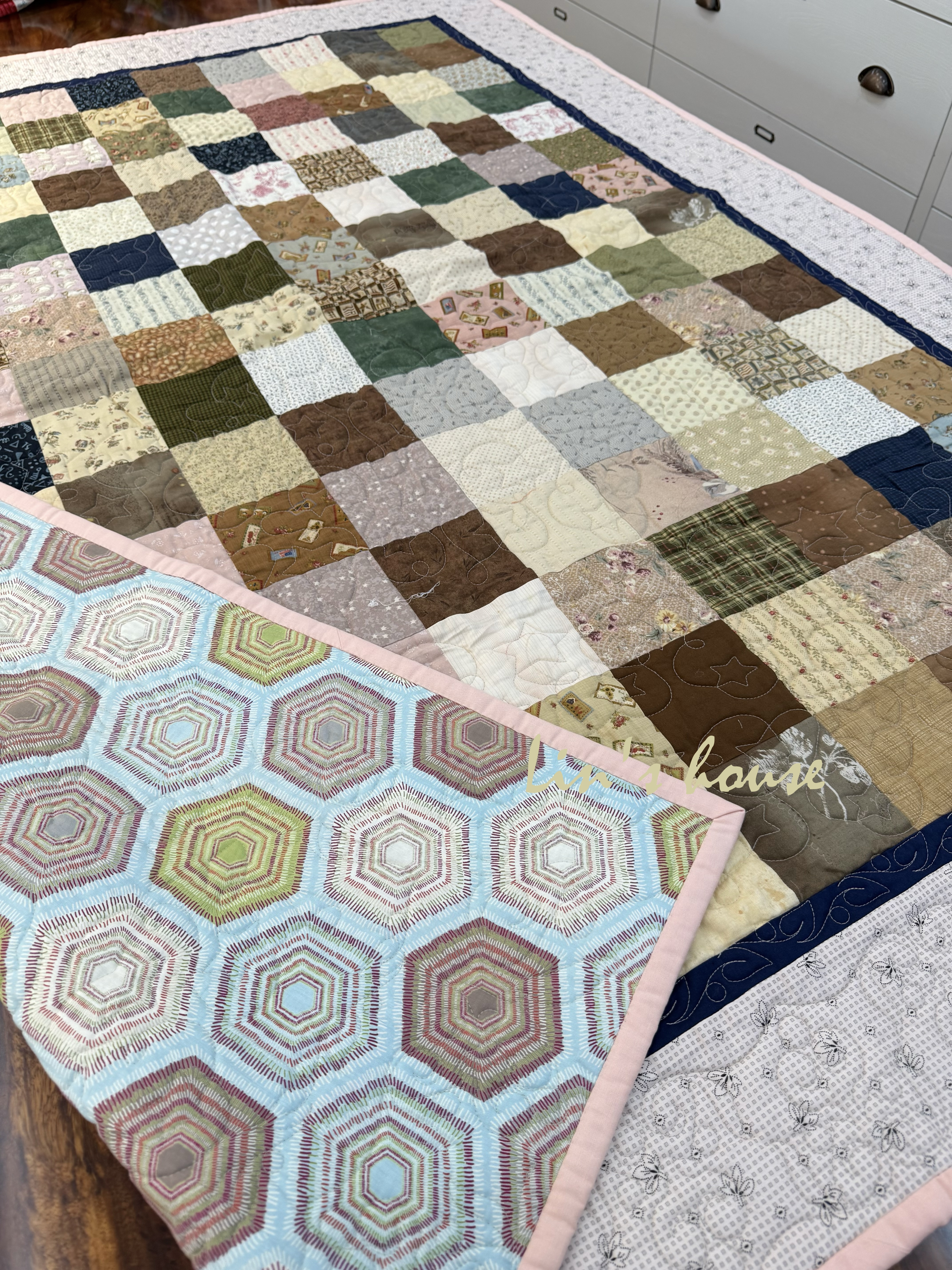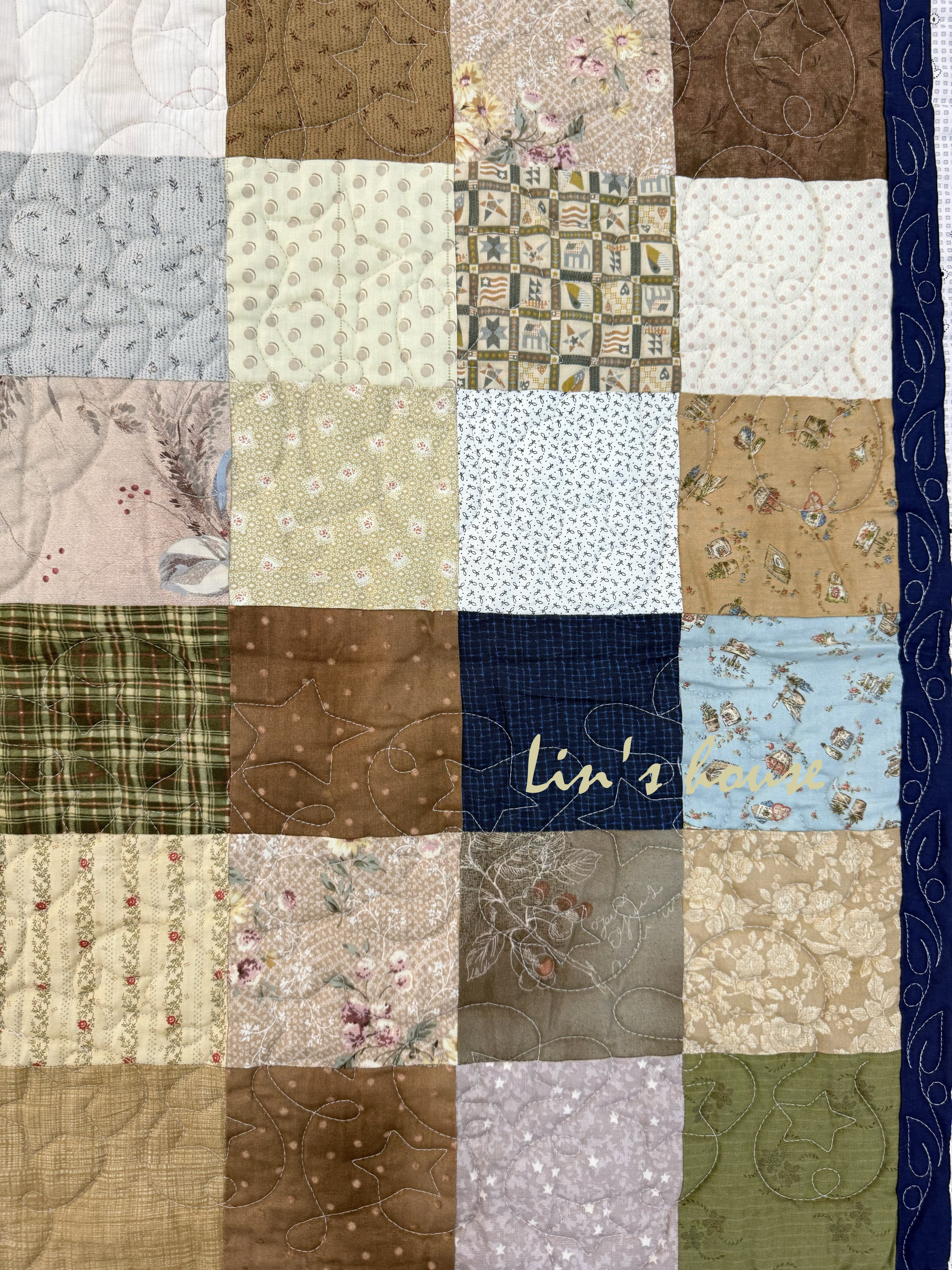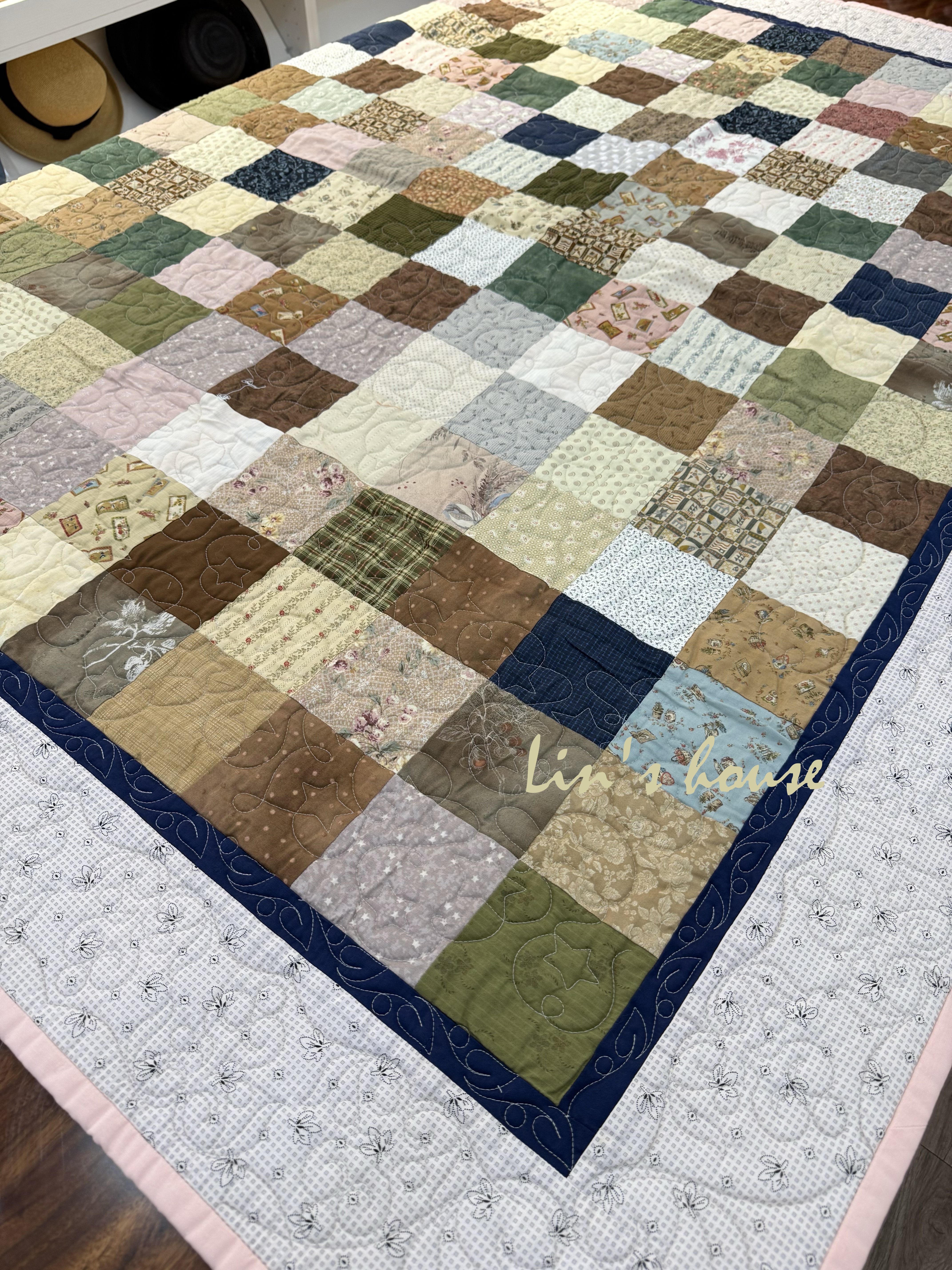 這件拼布作品以簡潔的方塊設計為基礎,將各種復古花布、格紋與碎花圖案和諧拼接而成。溫潤的米色、草綠、茶褐與粉膚色交織,呈現出柔和卻富有層次的田園氛圍。外框以深藍窄邊襯托,再由淺粉色寬框環繞,使整體更顯穩重而不失溫柔。